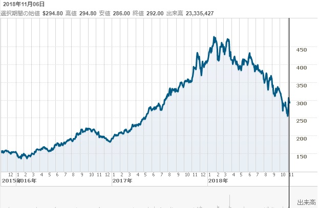 株価の挙動としては、2017年から2018年の間に、かなり高騰しました。